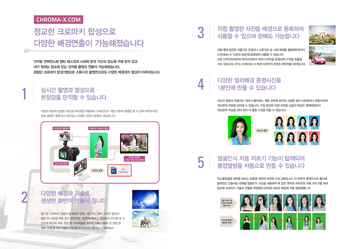 아이폰을 이용한 실시간 모니터링 시스템을 제공하며 실제 촬영된 사진을 자동인식하여 다양한 고퀄리티 배경과 크로마키합성이 손쉽게 이루어집니다. 또한 디자인몰에서 저렴한 가격으로 다양한 배경을 추가 구매 가능합니다.
