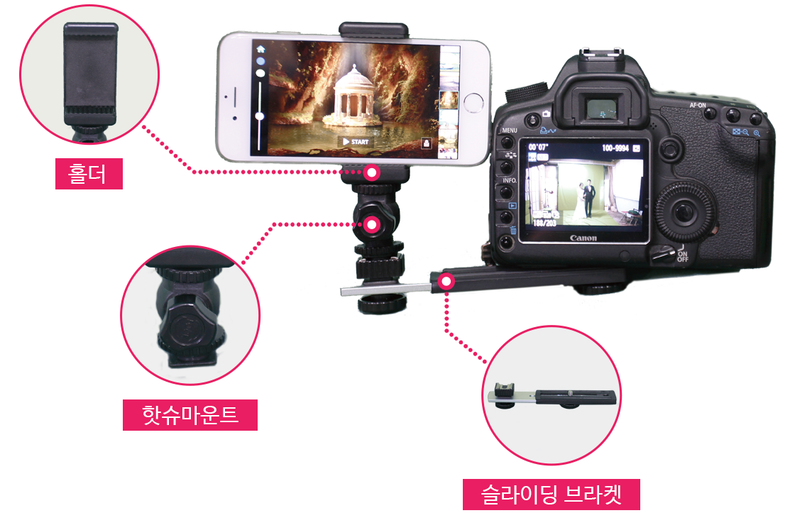 1-a카메라와 아이폰을 수평으로 고정하기 위해 사용되는 도구 : 홀더, 핫 슈 마운트, 슬라이딩브라켓